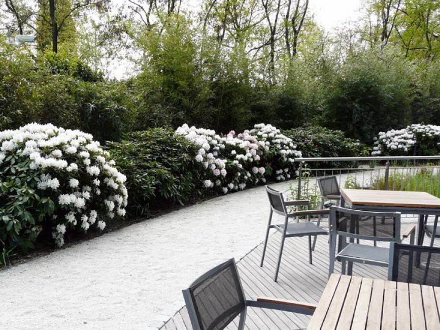 Im Frühjahr blühen mehr als zwanzig verschiedene Rhododendronsorten zu unterschiedlichen Zeiten von Anfang April bis Juni. Sie stehen auf einem Wall und dienen unter anderem auch dem Lärm- und Sichtschutz. Für Wochen stellen sie einen attraktiven Blickfang dar.