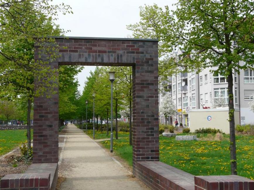 Das Tor zur "Grünen Mitte": Ein Torbogen aus Klinker, einem Material, das schon am Rathaus und Bürgerhaus, später denn am neuen Kreishaus zum Einsatz kam. Der Klinker zieht sich dann wie ein roter Faden durch die Grüne Mitte.