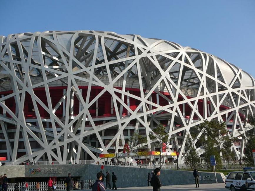 Das Vogelnest – großartige Architektur zur Olympiade entstanden. Eines der vielen Gebäude, die die zeitgenössische Architektur exemplarisch zeigen. Es gibt Tausende von interessanten Hochhäusern, die oft an der Spitze eine Pagodenform tragen, Erinnerung an die alten Gebäude.